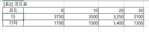 : [표1]의 '상품코드'의 왼쪽 1글자는 "가, 나, 다" 중 하나인데 [표2] 코드표의 코드는 "다, 기타"입니다. 즉, "다"와 그 외의 코드로 구분하라는 의미이지요.