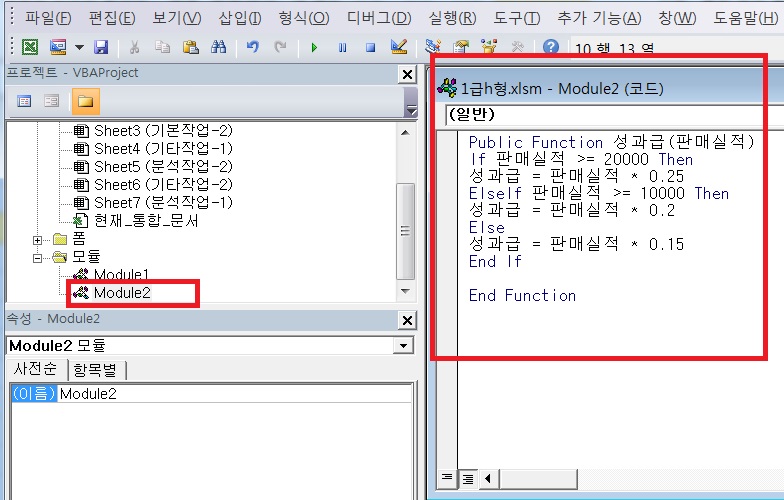 1. 사용자 정의 함수를 모듈에 작성해야 하는데 시트에 작성하셔서 정상 실행 되지 않았습니다.