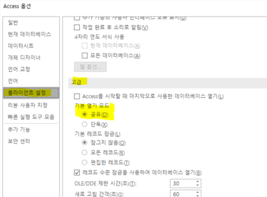 아래 화면처럼 Access 옵션에서 기본 열기 모드를 [공유]로 지정 후 확인 부탁드립니다.