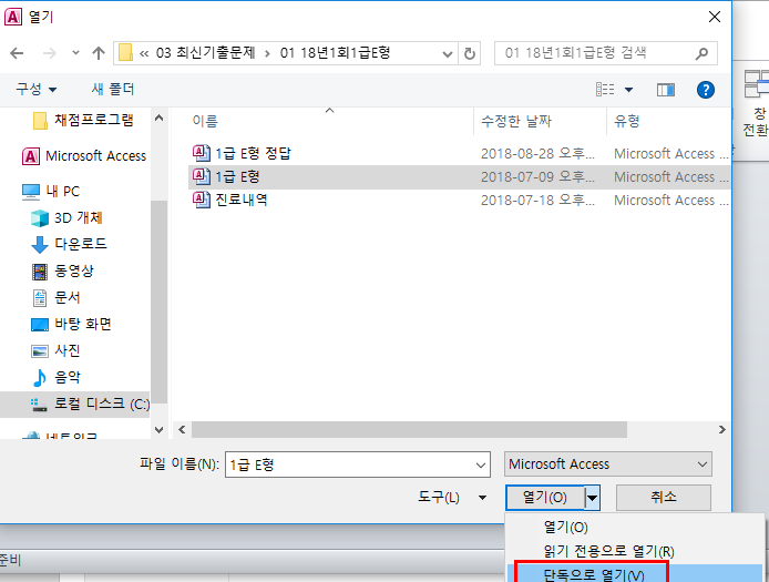 1. 액세스를 실행한 후 [파일]->[열기]에서 단독으로 열기 실행