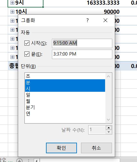 오전에 해당하는 범위를 블록으로 지정한 후 그룹을 지정하시고