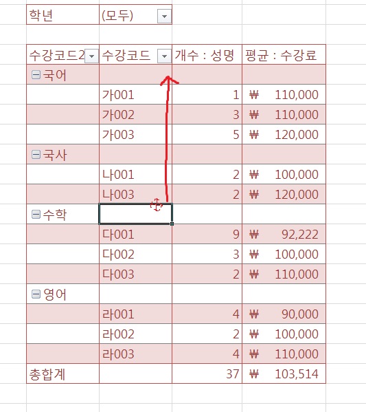 2. 아래와 같이 피벗테이블의 수강코드 부분을 선택 한 후