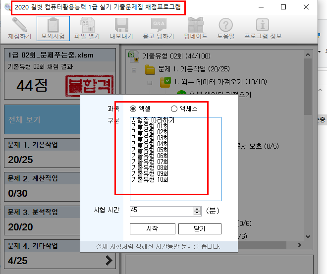2. 다른 도서의 채점프로그램을 사용 - 기본서 채점프로그램명은 '2020 길벗 컴퓨터활용능력 1급 실기 채점프로그램'입니다.