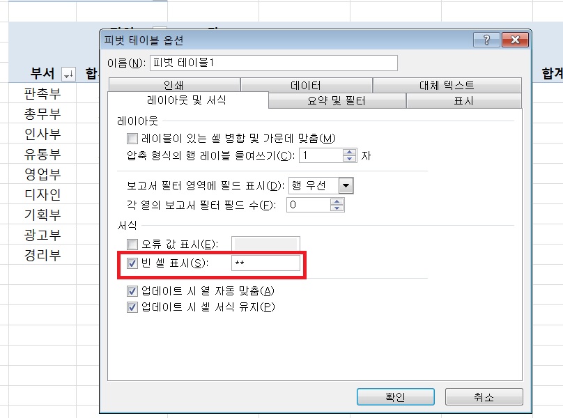 3. '레이아웃 및 서식'에서 아래 이미지와 같이 '빈 셀 표시'를 설정해주세요.