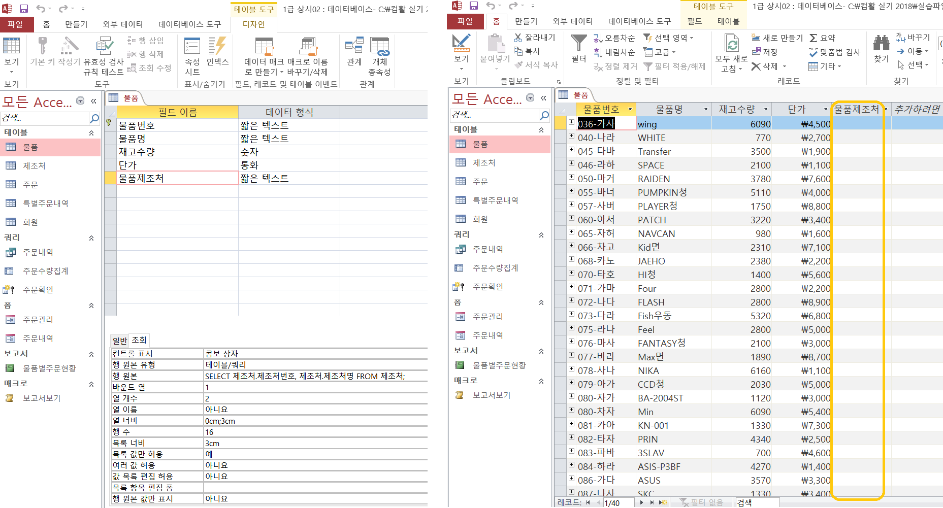 - 필드에는 제조처번호가 저장되도록 설정할 것