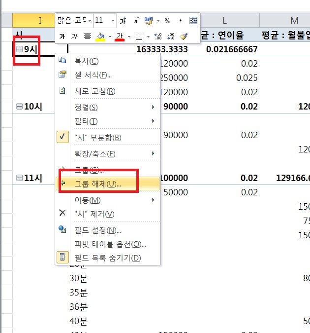 아래 그림과 같이 시에 대해 그룹을 해제한 후