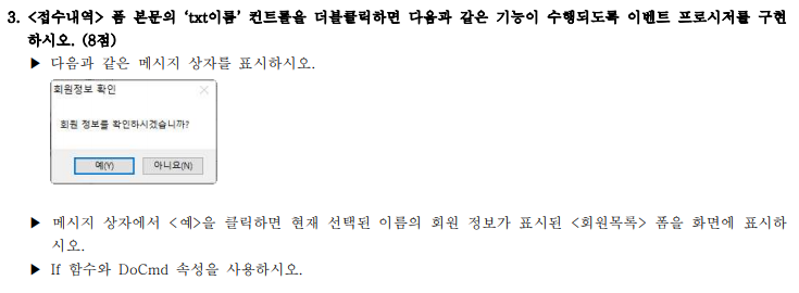 문제4 처리기능구현의 3번문제에서 마지막에 메세지박스가 뜨는 화면에서 확인을 누르면 회원정보창이 안뜹니다. 정답파일에서는 확인을 누르면 회원정보창이 뜹니다.