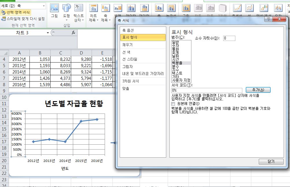 차트 세로축값 표현하는것 중 0%추가했는데 자동으로 백분율로 넘어가서 값이 저렇게 표시됩니다.