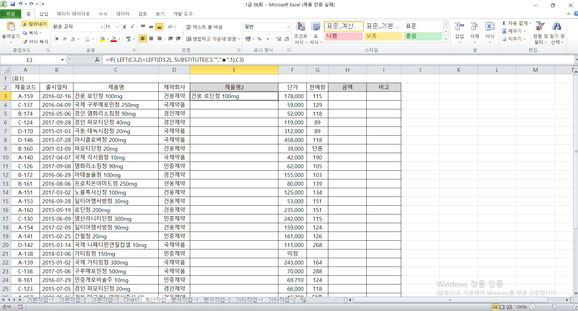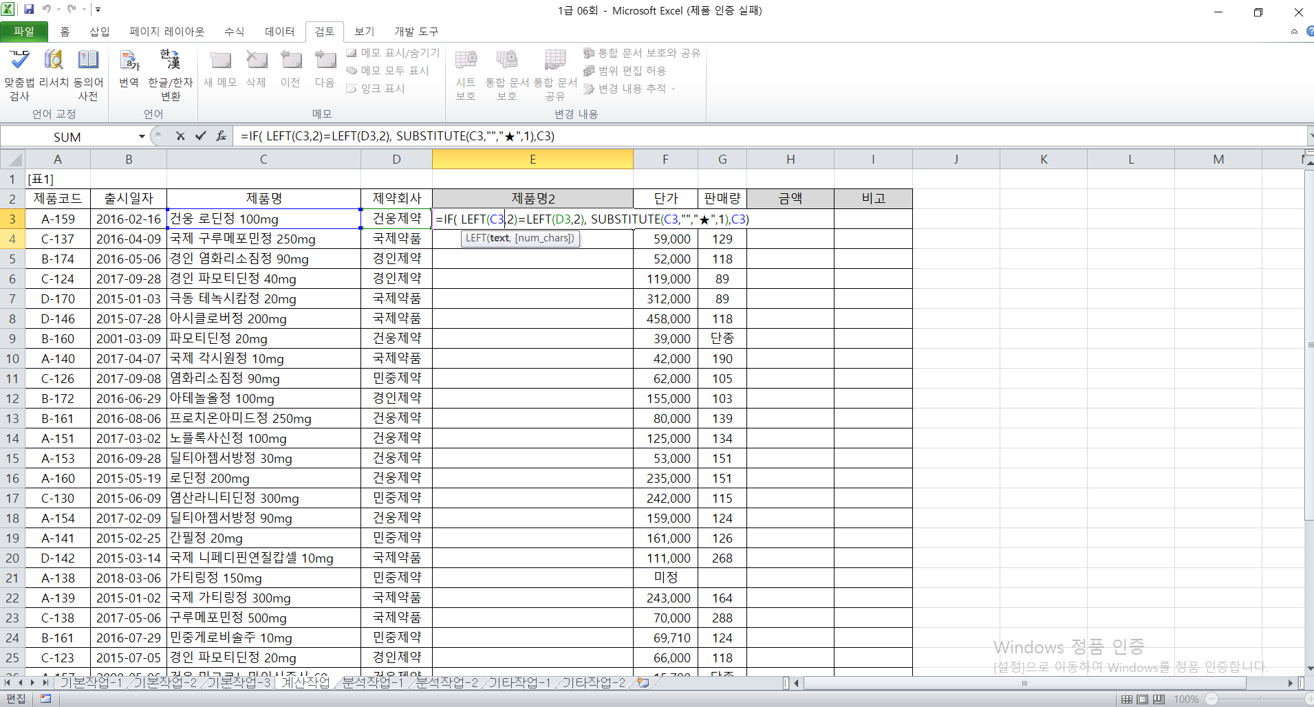 149페이지 2-1번 문제에서 제품명2 = if (left(c3,2)=left(d3,2), substitute(c3,"","★",1),c3) 로 입력하였는데 위와 같이 첫번째 빈칸에 기호가 들어가지 않고 나오는데