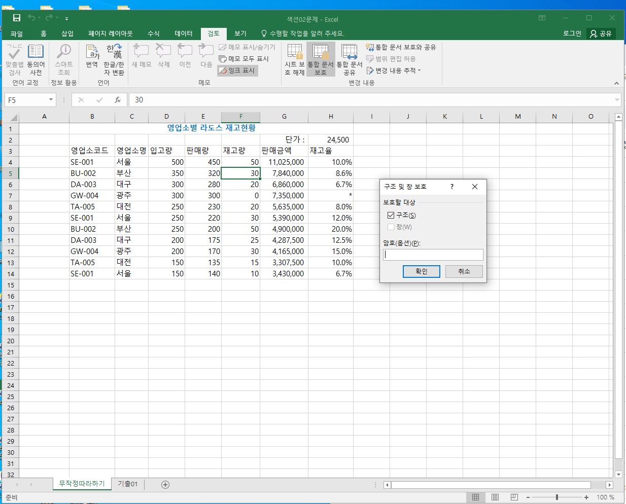 셀서식 및 보호 "구조 및 창보호" 대화상자에서 창 클릭이 활성화 되어있지 않아요.