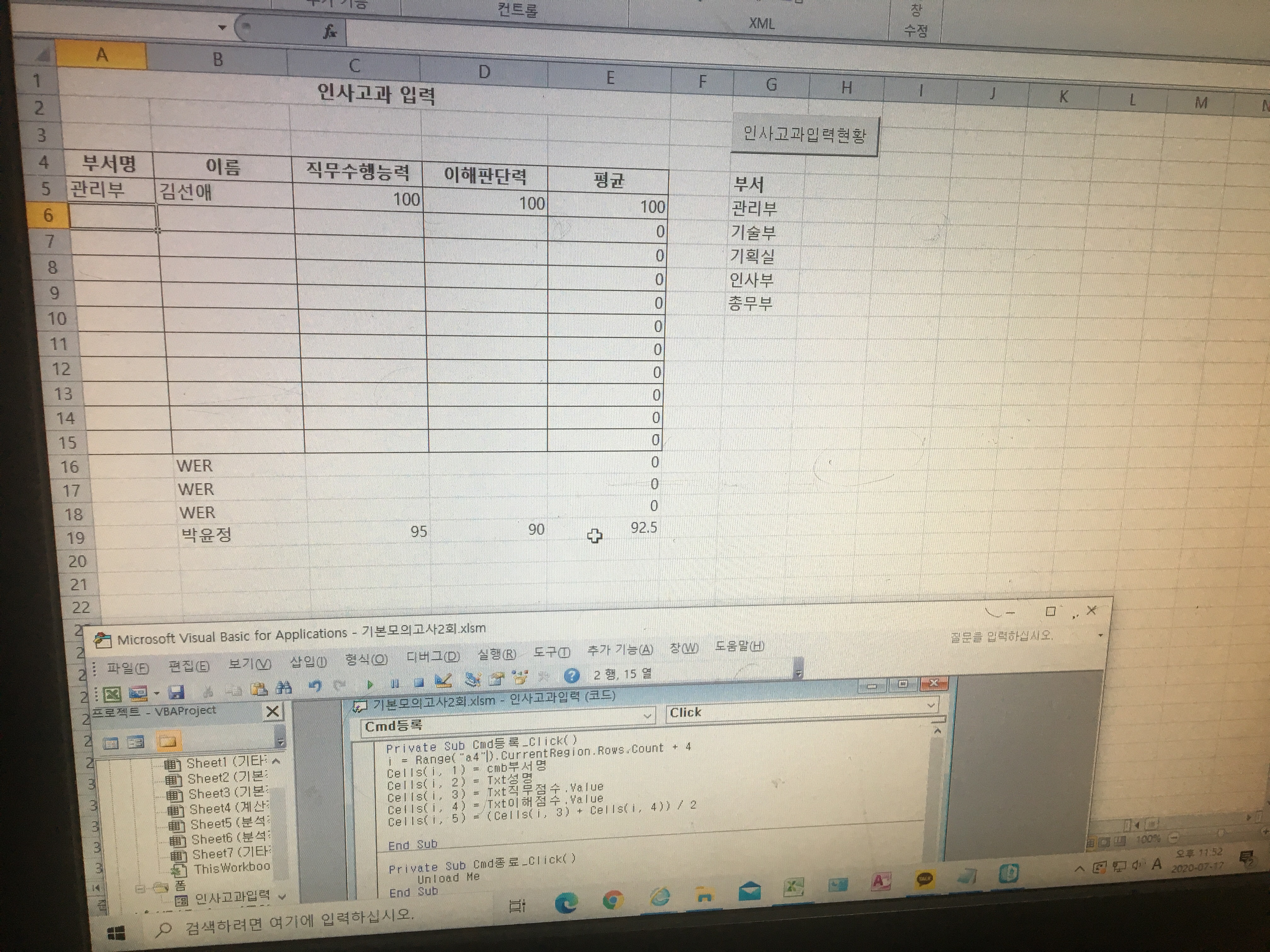 사진과 같이 표 바깥에 나타나는 것은 visual basic 입역할때 문제가 있었던 것인가요?