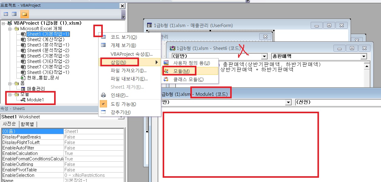 프로젝트 창에서 오른쪽 클릭 -> 삽입 -> 모듈 을 선택한 후