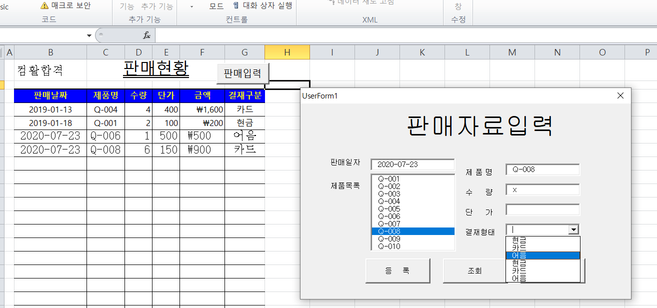 등록을 누르면 워크시트에 저렇게 들어가긴하는데 결재형태 부분..이 이상한거아닌가요?? 현금 카드 어음 한번씩만 안나와도 되는건가요..?