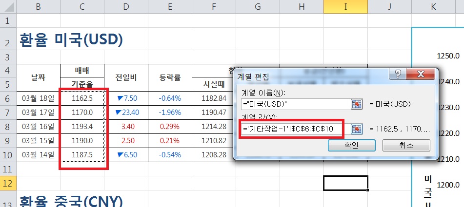 데이터 선택에서 -> 범례 항목(계역)-> 미국(USD) 선택 후 -> 편집 을 선택한 후