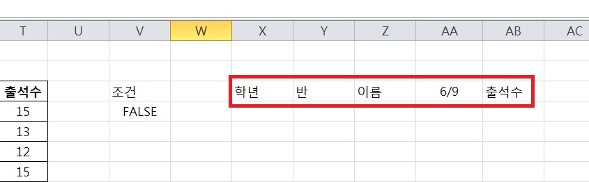 '학년','반','이름','6/9','출석수' 열을 순서대로 표시하라고 하는데 책의 풀이 대로 하면 모든 6/9일 열에 대한 내용뿐만 아니라