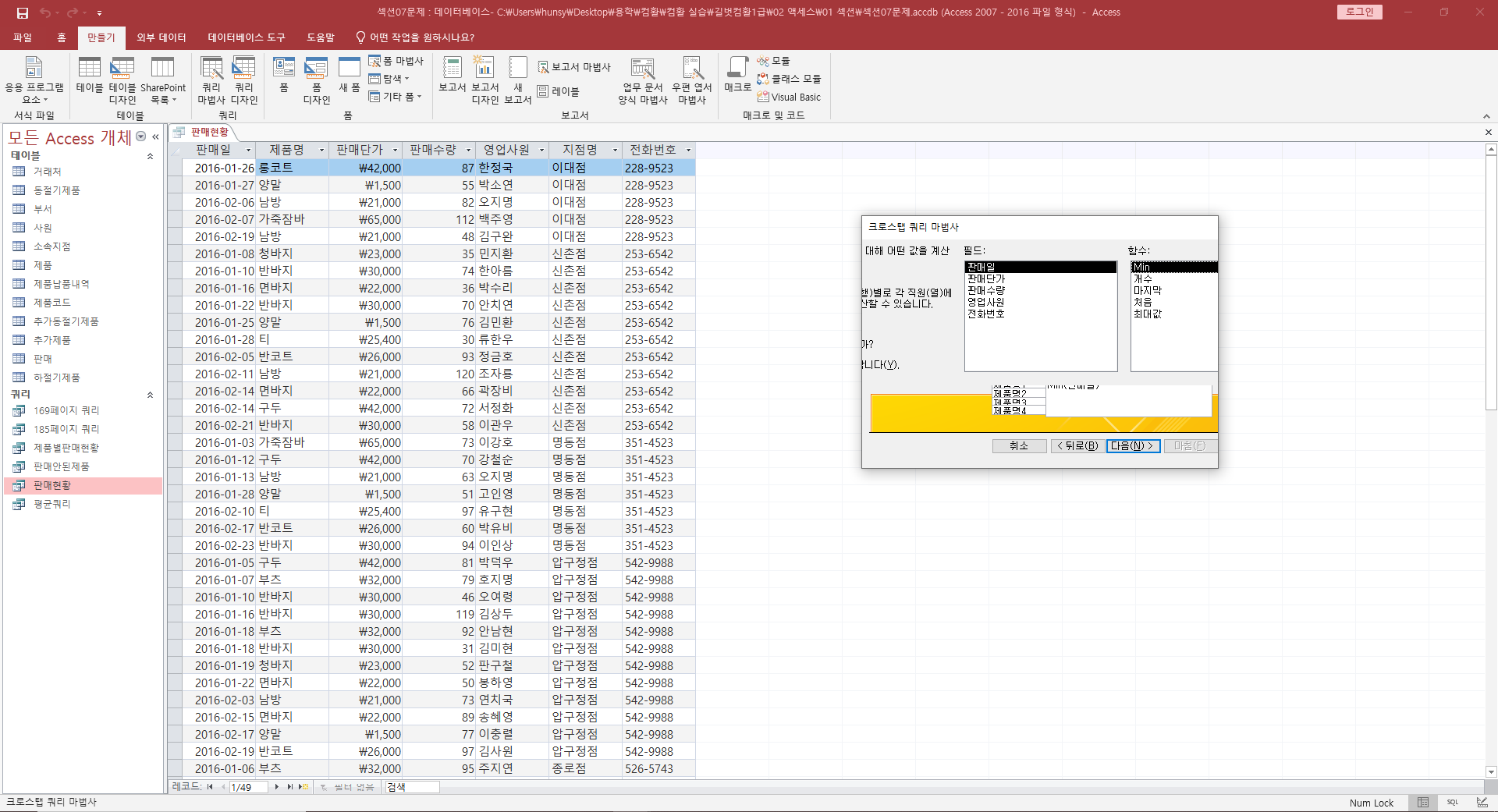 사진과 같이 쿼리 마법사 대화상자만 크기가 잘려서 나옵니다.