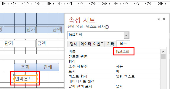 아래 빨강색으로 표시한 텍스트 상자의 컨트롤 이름을 'txt조회'로 지정해야 하는데, 'Text조회'로 지정했기때문에 오류가 발생한 것입니다. 이 컨트롤의 이름을 'txt조회'로 변경해 주세요.