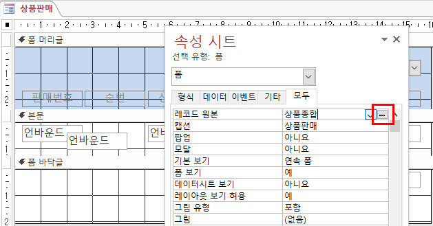 폼 선택기를 더블클릭하여 ‘폼’ 속성 시트 창을 연 후 ‘데이터’ 탭의 ‘레코드 원본’ 속성을 클릭하여 나타나는 작성기 단추를 클릭하면 '상품판매 : 쿼리 편집기'가 실행이 됩니다.