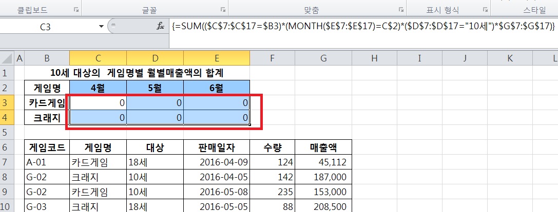 c3셀에 =SUM(($C$7:$C$17=$B3)*(MONTH($E$7:$E$17)=C$2)*($D$7:$D$17="10세")*$G$7:$G$17) 을 입력한 후