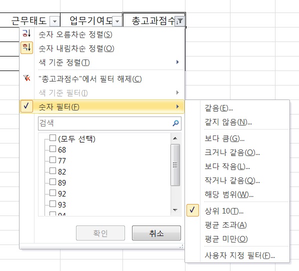 텍스트 필터가 아니라 숫자 필터로 표시가 되어야 합니다.
