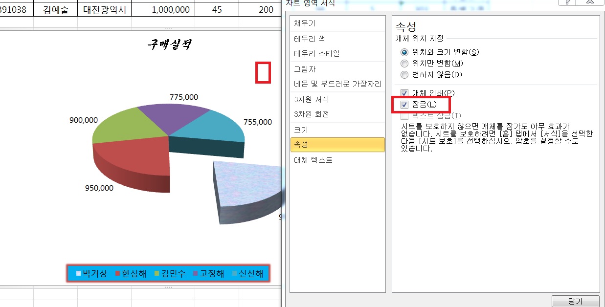 시트 보호 후에 차트 영역 서식에서 잠금설정을 하려고 하는데