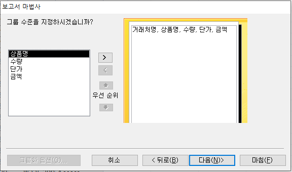 '판매내역' 테이블을 만들때 거래처명 필드의 데이터 형식을 텍스트로 해야 하는데, 님은 메모로 했기 때문에 해당 부분에서 그룹 지정이 안된 것입니다. 거래처명 필드의 데이터 형식을 텍스트로 변경한 후 보고서를 다시 작성해 보세요.