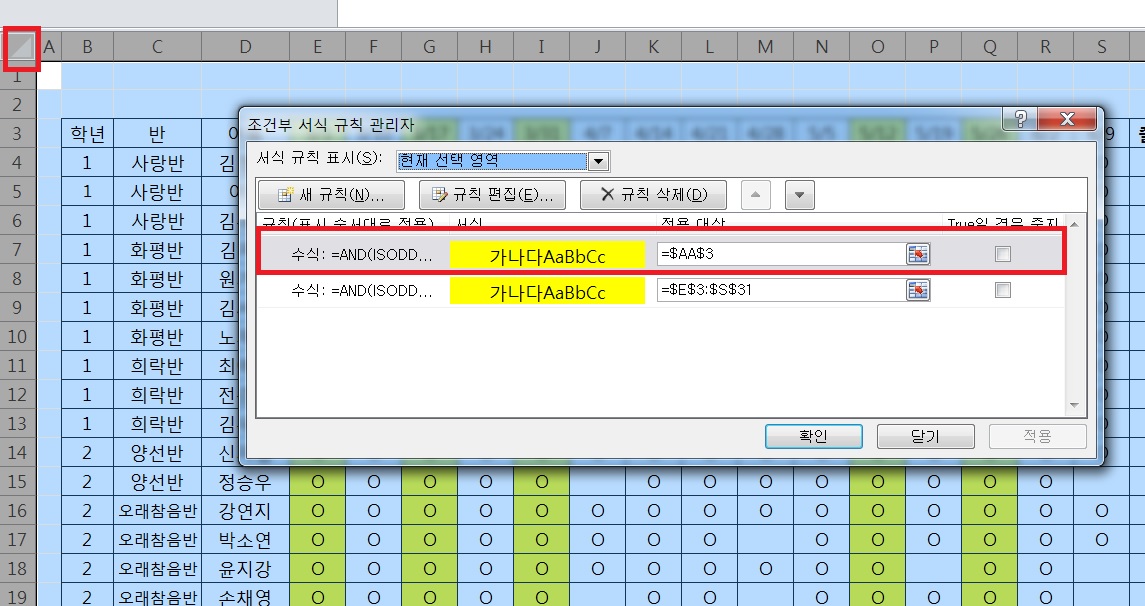 조건부서식에서 전체선택을 했을 때 규칙이 여러개 나오는 이유가 무엇인가요?