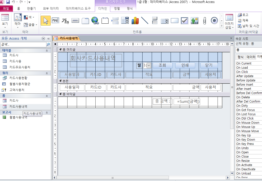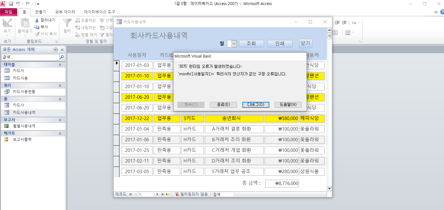 파일에서 카드사용내역 폼을 열려고 시도하면 강제로 액세스 프로그램이 종료 됩니다.