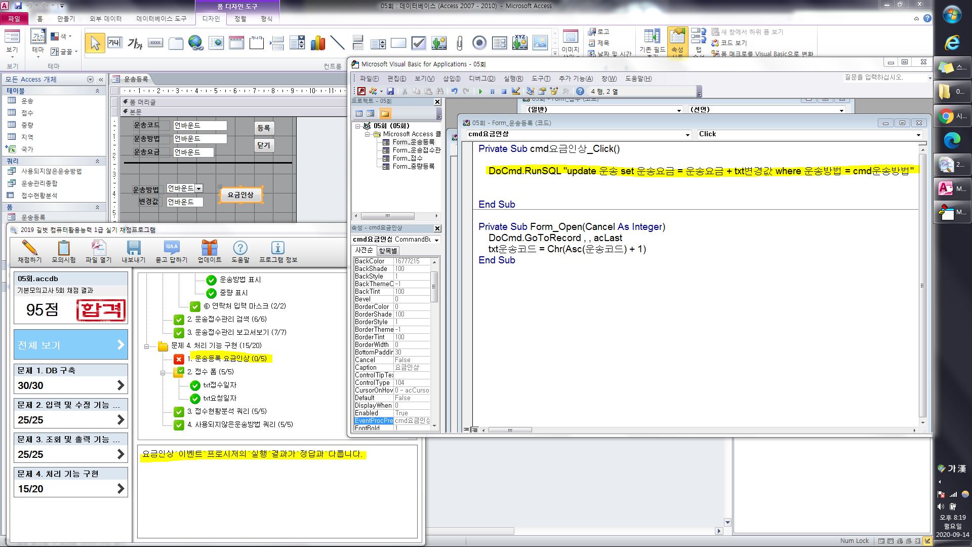 채점프로그램에서 '요금인상 이벤트 프로시저의 실행 결과가 정답과 다릅니다.'라고 나옵니다.