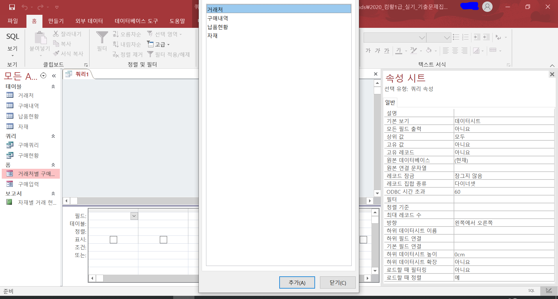 액세스 쿼리 디자인 진행할때 쿼리를 추가해야하는데 테이블추가 창에서 창 윗부분이 잘려서 쿼리를 추가할 수가 없는데 어떻게 해야하나요?