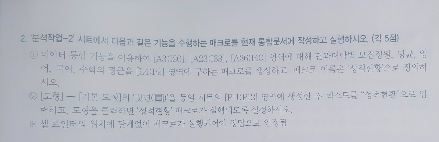 1. 별책부록(2019년 1회 1급 E형 p.161)에서 문제3 2번. '분석작업-2'시트에서 다음과 같은 기능을 수행하는 매크로를 현재 통합문서에 작성하고 실행하시오