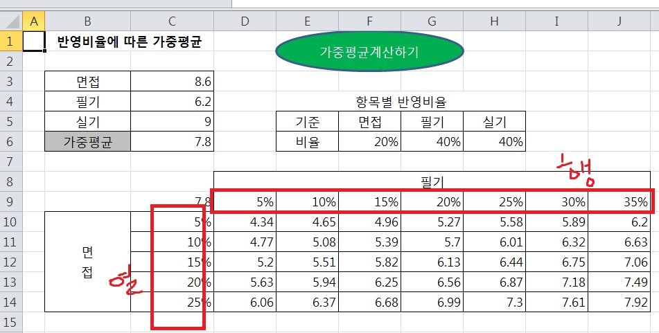 해당 셀을 지정하는 이유는 식에 사용된 값 중 필기의 반영 비율과 면접의 반영 비율이 달라 졌을 때