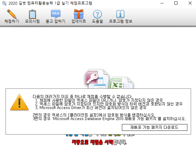 암호를 풀기 전에도 채점프로그램 오류가 발생했으며 그래서 암호를 풀고 채점을 시작해봤으나 "마이크로 엑세스에서 데이터베이스를 열 수 없습니다. 데이터베이스가 없거나, 다른 사용자가 단독모드로 열었거나, ADP파일이 아닙니다." 라고 만뜸니다. 파일은 한개 밖에 보낼 수 없음으로 글로 대체합니다.