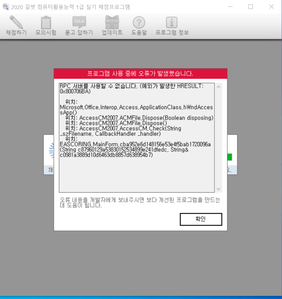 해당오류는 채점 중 실행 중이었던 오피스 프로그램이 종료된 경우나
