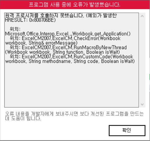 해당오류는 윈도우 환경 문제로 비쥬얼 베이직 쪽에서 오류가 발생한 것으로 보여집니다.