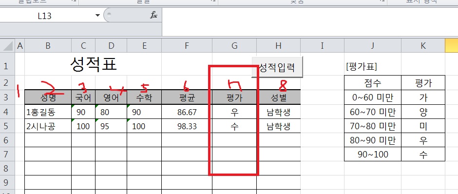 행은 입력행에서 구한 숫자가 입력되고 열에는 7 이 입력되어 7번째열에 있는 평가열에 값이 입력되는 것입니다.