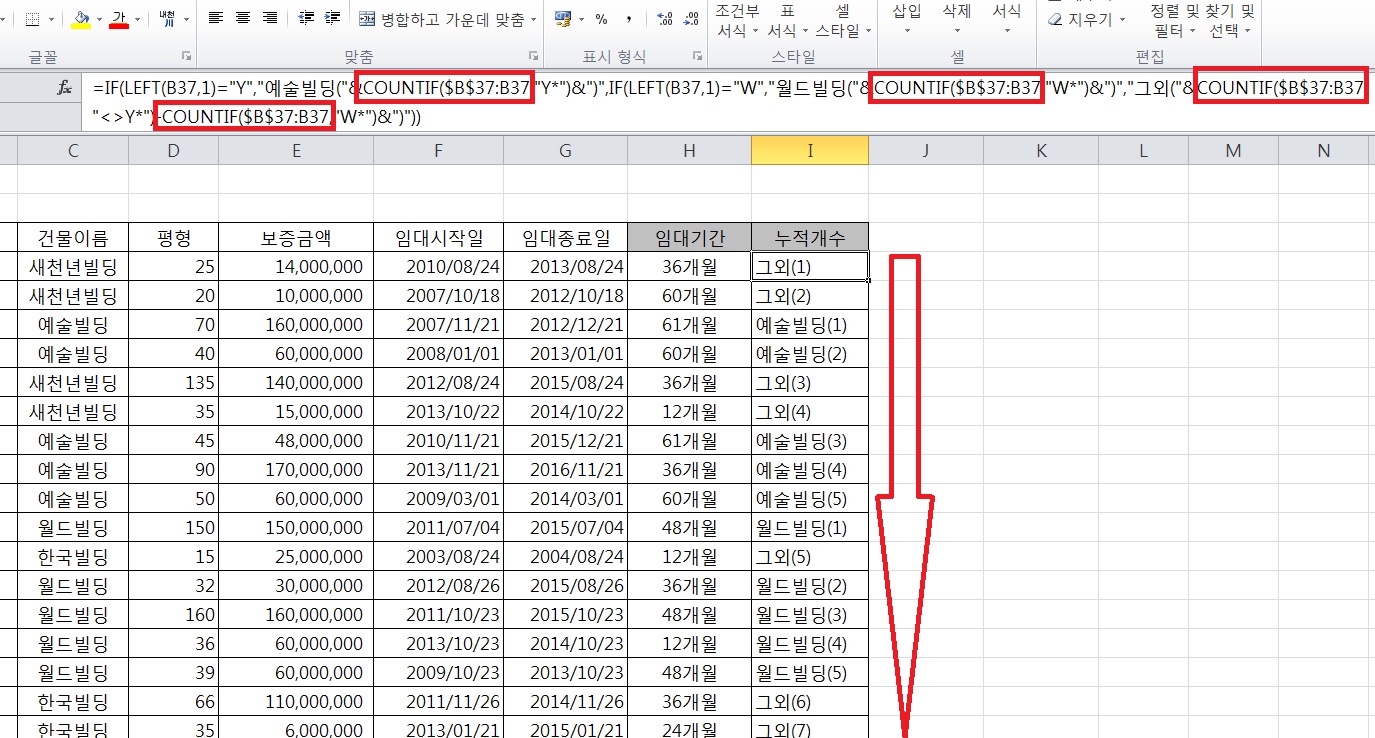 countif($c$37:c37,"예술빌딩") 으로 작성하면 예술빌딩인 개수를 구하게 됩니다.