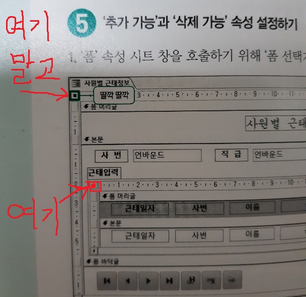 260쪽에서 사원별 근태정보의 기본폼의 속성 시트에서 삭제 가능 '아니요'를 했는데 거기서 할 게 아니라