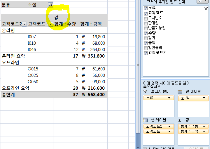 p188 피벗테이블 보고서 에서 '값' 부분이 자동으로 생성되어