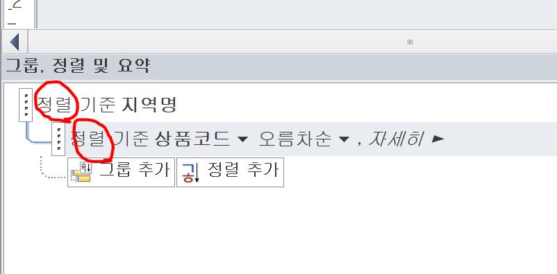 지역명에 대해서 그룹 머리글과 바닥글을 설정해야 하므로 정렬 추가만 하시면 안됩니다.
