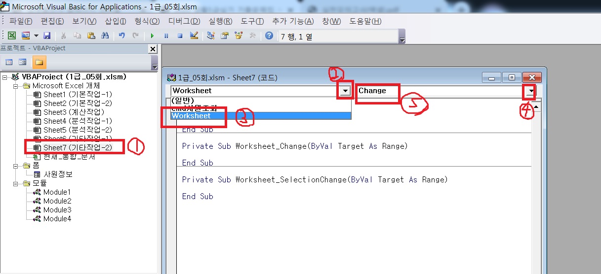 기타작업-2 시트를 더블클릭 한 후 개체 선택 콤보상자에서 worksheet를 클릭 -> 프로시저 선택 콤보상자에서 change를 선택하고 입력하세요.