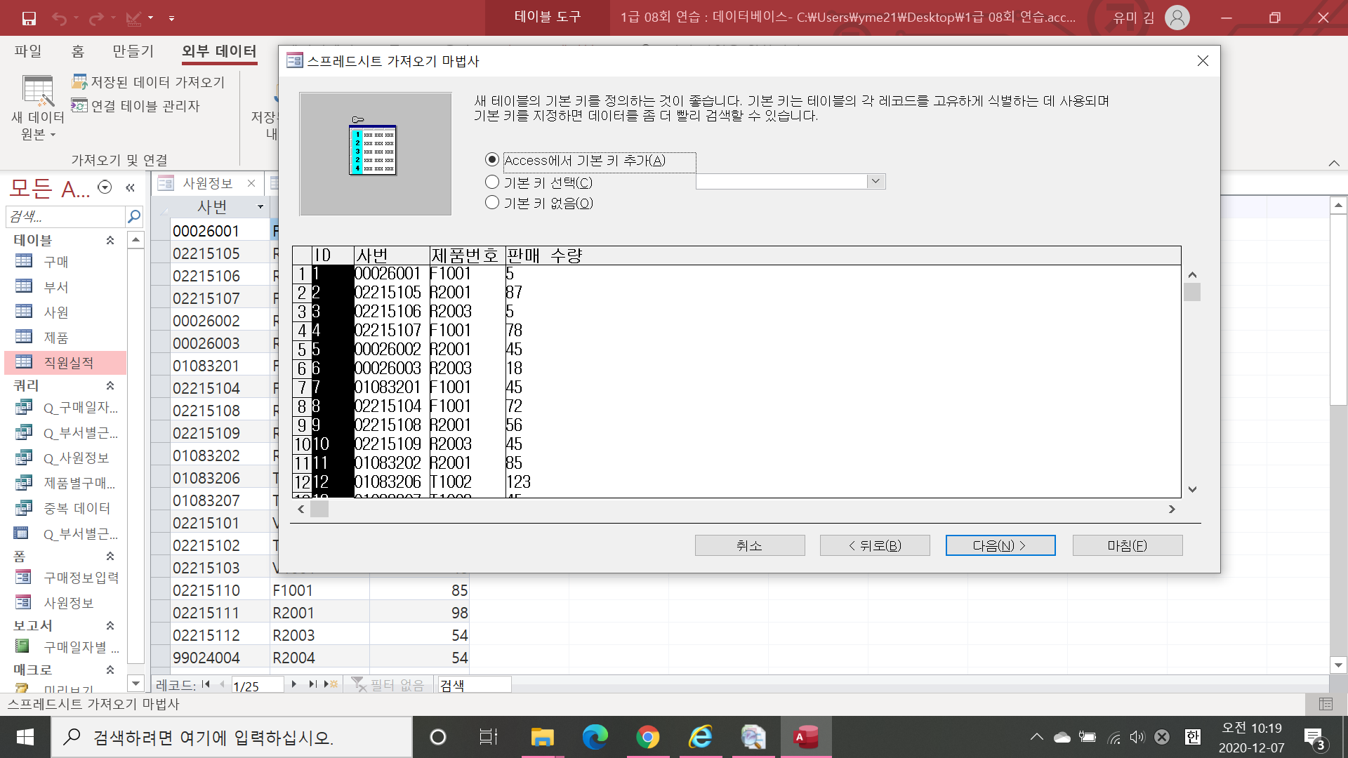 문제에 지시가 없어서 그냥 다음을 눌렀는데 답이랑 다르네요 기본키 없음으로 설정해야되는지 어떻게아나요?