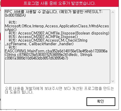 문의주신 오류는 채점 중 실행 중이었던 오피스 프로그램이 종료된 경우나