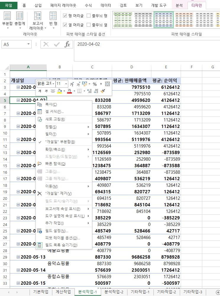 외부데이터 csv파일 형식을 가져와서 피벗테이블 작성화면까지 진행하게 되면 날짜 데이터일때 그룹 자체가 뜨지를 않습니다.