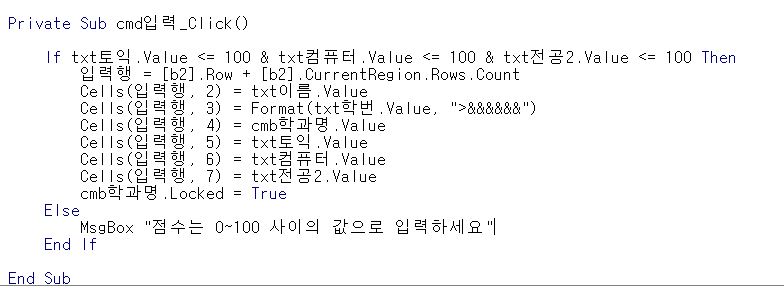 저는 '만약 토익, 컴퓨터, 전공2 점수가 모두 100보다 작거나 같으면 Cells로 입력 아니면 메세지박스 출력'으로 풀었는데요,