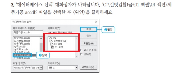 책에서 맨 처음에 외부데이터를 마이크로소프트 쿼리에서 가져오라고 해서 하고 '데이터 원본 선택' 상자에서 데이터베이스-ms access database 클릭하라고 해서 그대로 했는데 책에서 나오는 것처럼 대출관리,도서현황 상공대학 등 여러가지 파일이 나와야 되는데 database1 이라는 파일 하나밖에 안뜨는데 뭐죠?? 빠른 답변 부탁드립니다.