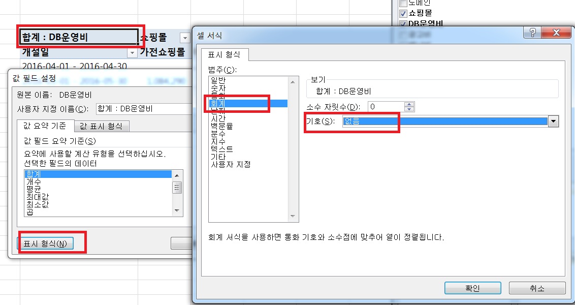 아래 그림과 같이 값 필드 설정의 셀 서식을 이용하여 기호 없는 회계 서식으로 지정하세요.