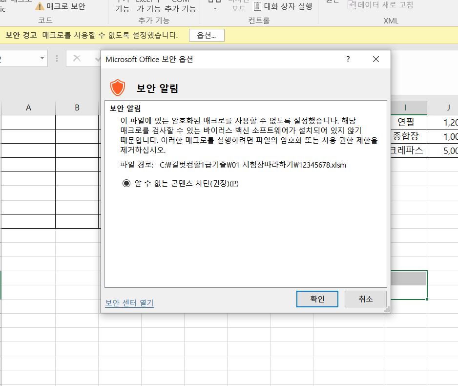 [파일]-[옵션] 선택 -> [보안 센터] 탭에서 [보안 센터 설정] 클릭 -> [매크로 설정] 탭에서 '모든 매크로 포함'을 선택한 후 <확인>을 클릭하세요.