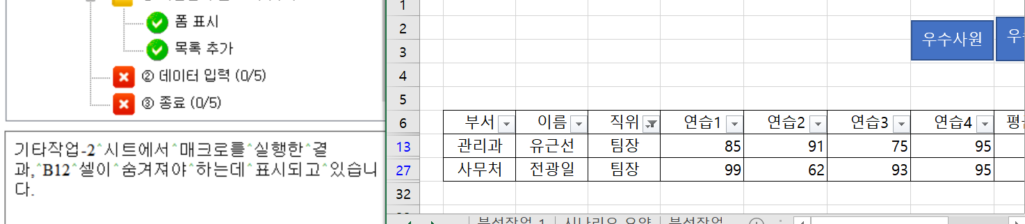 채점프로그램에서 틀린 이유가 저렇게 나왔는데 B12셀은 두개 매크로 실행해도 숨겨져있고 정답이랑 같은데 채점 오류인가요?