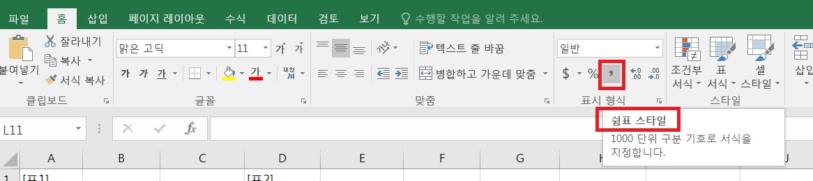 아래 그림과 같이 홈 -> 표시형식 -> 쉼표스타일 을 지정하면